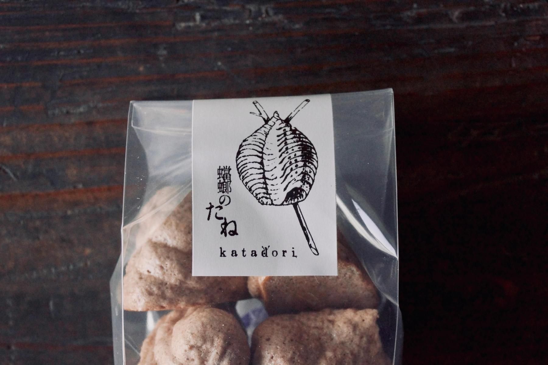 カマキリの産卵方法を参考に、一つ一つ手絞りで仕上げた軽い食感のメレンゲクッキー「蟷螂のたね(とうろうのたね)」。