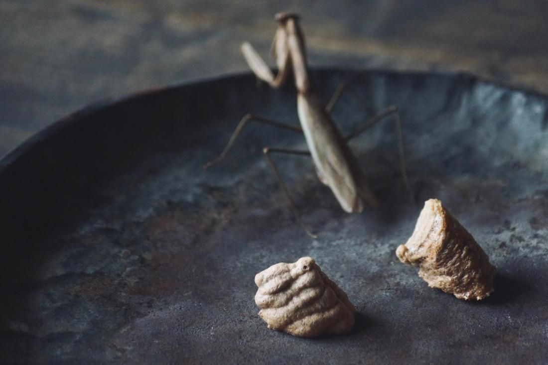 ココアパウダーでスポンジ部分の色味を、ココナッツファインで卵の粒感を表現し、本物のカマキリの卵鞘(卵嚢)の質感に限りなく近づけました。